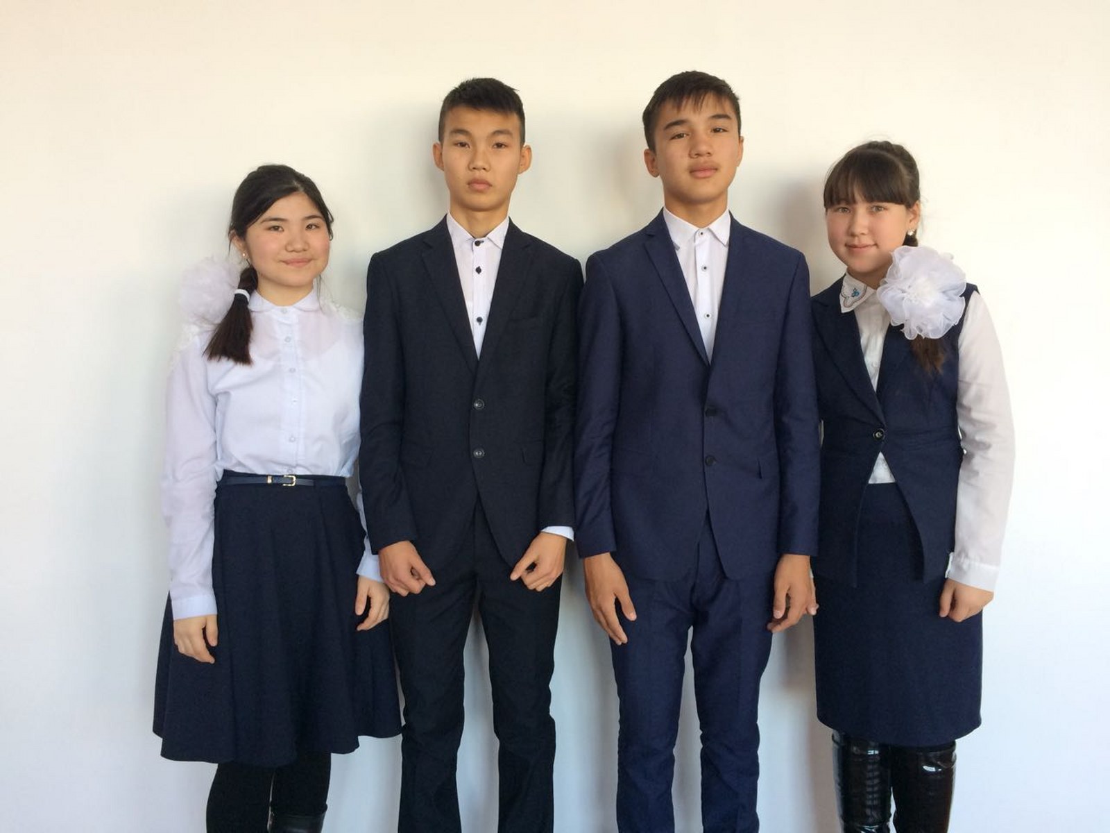 Қою көк түсті пиджак, жилет, белдемше, сарафан (тізеден 5 см түсіп тұруы керек) және ақ түсті жейде