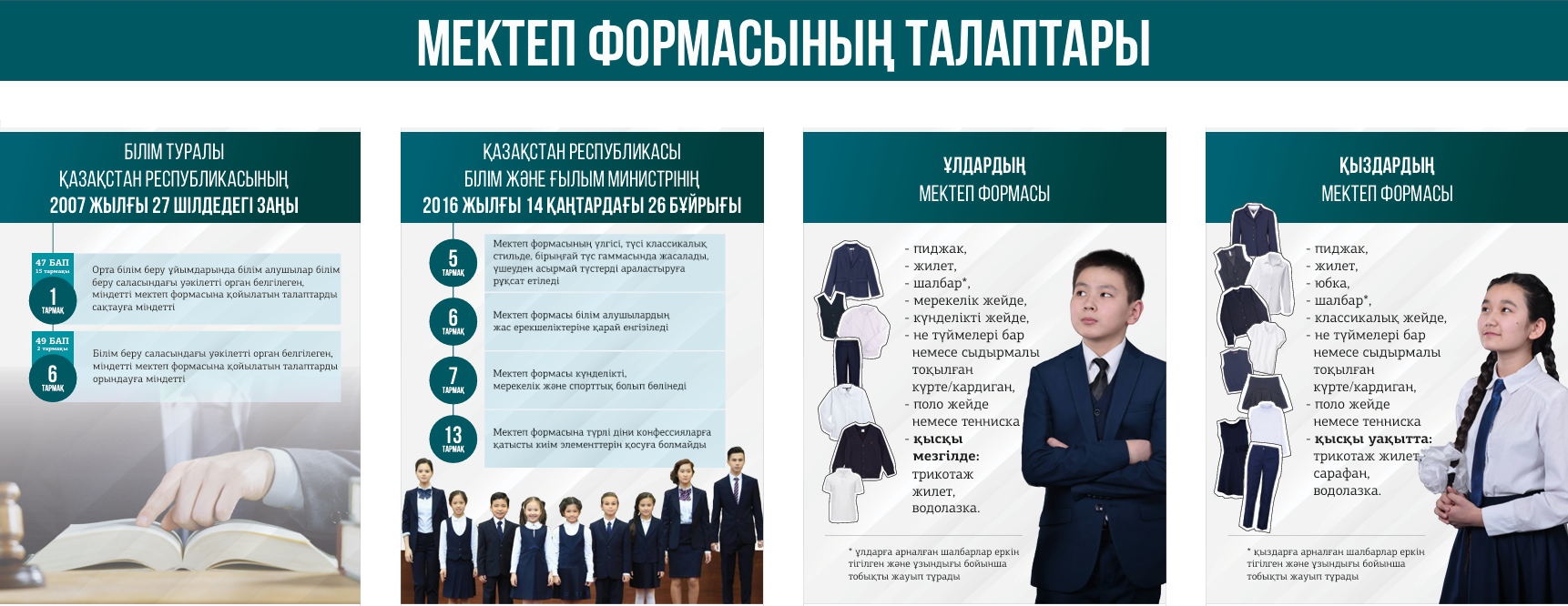 Қазақстан Республикасы Білім және ғылым миистрлігінің 2016 жылғы 14 қаңтардағы №26 бұйрығымен, білім беру мекемелерінің Жарғысымен белгіленген міндетті мектеп формасына қойылатын талаптарды орындауға, сондай-ақ білім алушылар білім беру ұйымында белгіленген киім формасын сақтауға міндеттелінді.